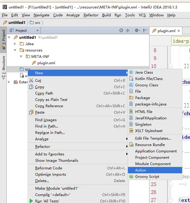 现在,我们有了插件项目了,我们点击src目录,这就是我们存放代码的地方,右键,新建一个Action